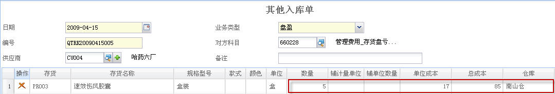 - 对比盘点表中的实存数量与账存数量,点击“库存-盘盈单”,可录入盘盈存货数量,并选择盘盈仓库。
