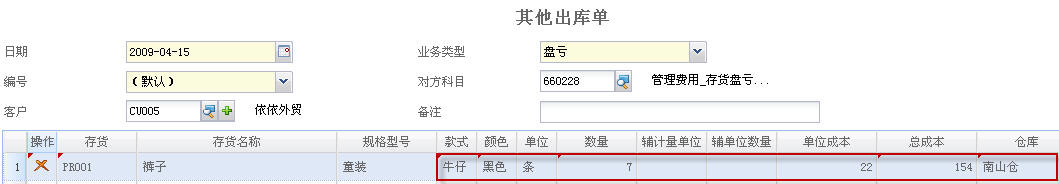 - 对比盘点表中的实存数量与账存数量,点击“库存-盘亏单”,可录入盘亏存货。